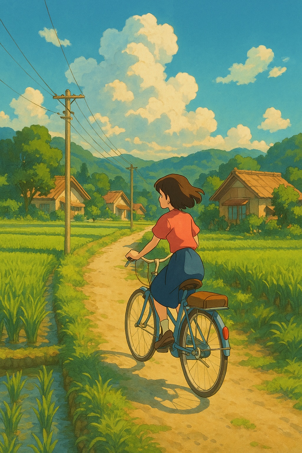 사용 프롬프트: a teenage girl riding a bicycle through a peaceful countryside village in summer, lush green rice fields, warm sunlight, clear blue sky with fluffy clouds, in Studio Ghibli style, highly detailed, soft colors, whimsical atmosphere, cinematic composition